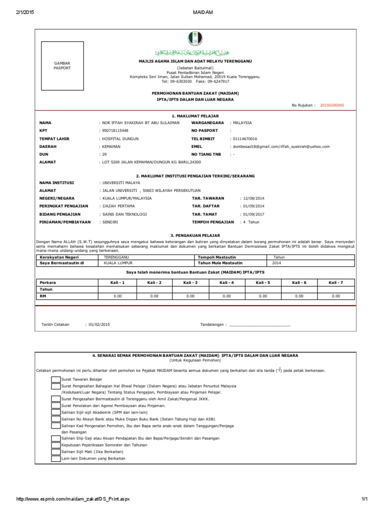 Pemohon perlu mencetak borang yang telah diisi dan menghantar ke pejabat yayasan pendidikan maidam beralamat di lot 9 & 10, tingkat 1, bazar maidam, jalan masjid abidin, 20100 kuala terengganu atau hantar. Jenis agihan/bantuan zakat sektor pendidikan. Berita gembira untuk anak terengganu yang sedang menuntut di institut pengajian tinggi (ipt) dalam dan luar negara! Ujar beliau, maidam amat bersimpati dengan nasib pemandu kereta sewa, penjaja dan tukang kasut berkenaan. Bermula 1 januari 2015, majlis agama islam dan adat melayu terengganu (maidam) telah menggunakan sistem permohonan zakat secara atas.