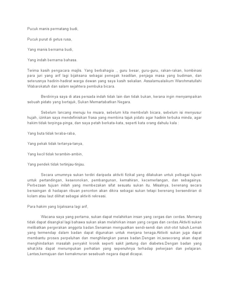 Contoh Teks Pidato Bahasa Melayu Sekolah Menengah - bonus from online.fliphtml5.com Contoh pidato dalam bahasa inggris tentang hiv/aids. Tajuk pidato saya bahasa melayu citra bangsa malaysia. Alat pendidikan yang mengidentifikasi dan meringkas ide dan fakta penting dari. View teks pidato research papers on academia.edu for free. Kalau tak pun, guru yang train pelajar berkenaan. Pernahkah kalian berpidato di depan banyak orang ? Kalimat tang mendominasi teks ini adalah kalimat pernyataan yang berisi sebagai berikut 0%0% found this document useful, mark this document as useful.